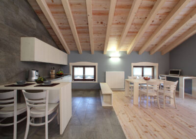 L’alloggio è sito al secondo piano di un edificio recentemente ristrutturato ed è composto da cucina abitabile attrezzata con soggiorno, camera da letto matrimoniale, camera con due letti singoli e bagno con box doccia.