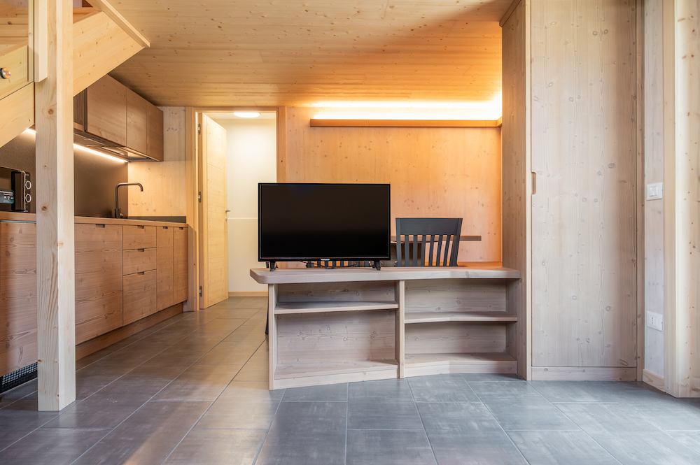 Rosa delle Alpi 3 è composto da un’ampia zona giorno con cucina, sala da pranzo e salotto. Completa il piano terra il bagno con box doccia. Le camere da letto, singola e matrimoniale, si trovano in un soppalco accessibile dal salotto.